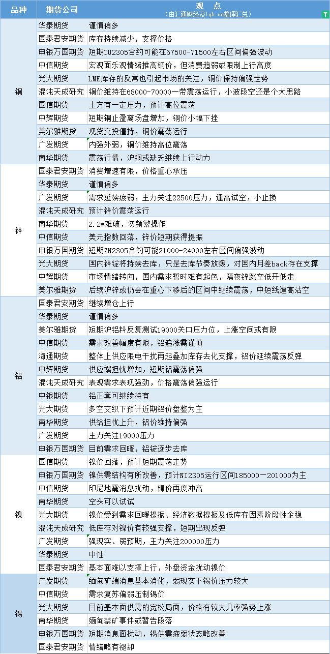 标题:期货公司观点汇总一张图:4月20日有色系(铜、锌、铝、镍、锡等)