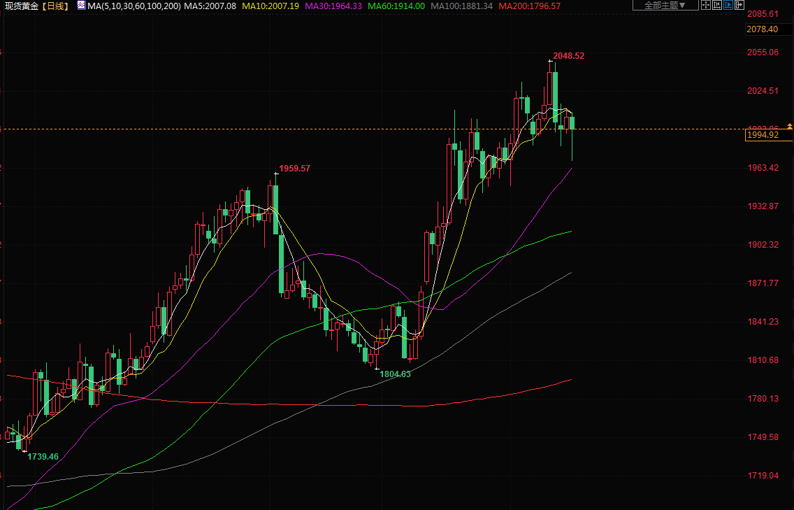现货金下跌0.5%,报每盎司1994.02美元,盘中早些时候曾下跌多达1.8%,至两周低点1969.09美元。