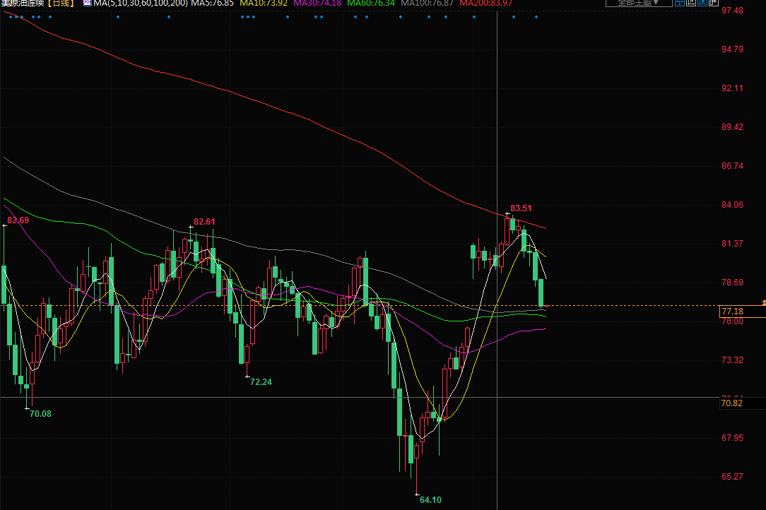 美原油交投于77.10美元/桶附近;油价周四下跌超2%,至3月底以来的最低水平,因担心可能出现的经济衰退会削弱燃料需求,以及美国汽油库存增加。