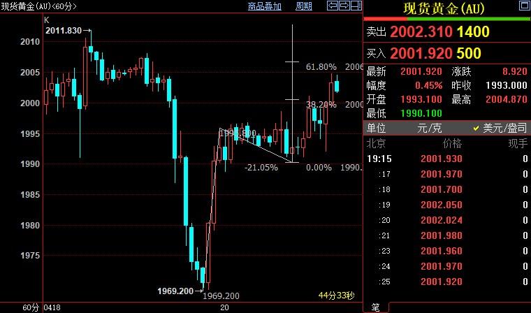 现货黄金上涨0.35%至2001.88美元/盎司;COMEX期金主力合约上涨0.31%至2013.6美元/盎司;