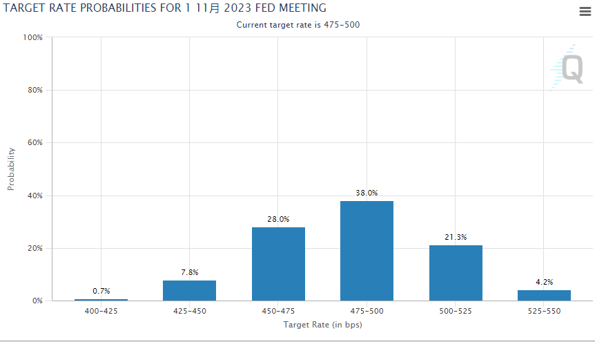 CME的“联储观察”工具显示,市场预计美联储5月份加息25个基点的可能性超过80%,随后几个月里利率保持在5.00%-5.25%区间,并最早从11月份开始降息。