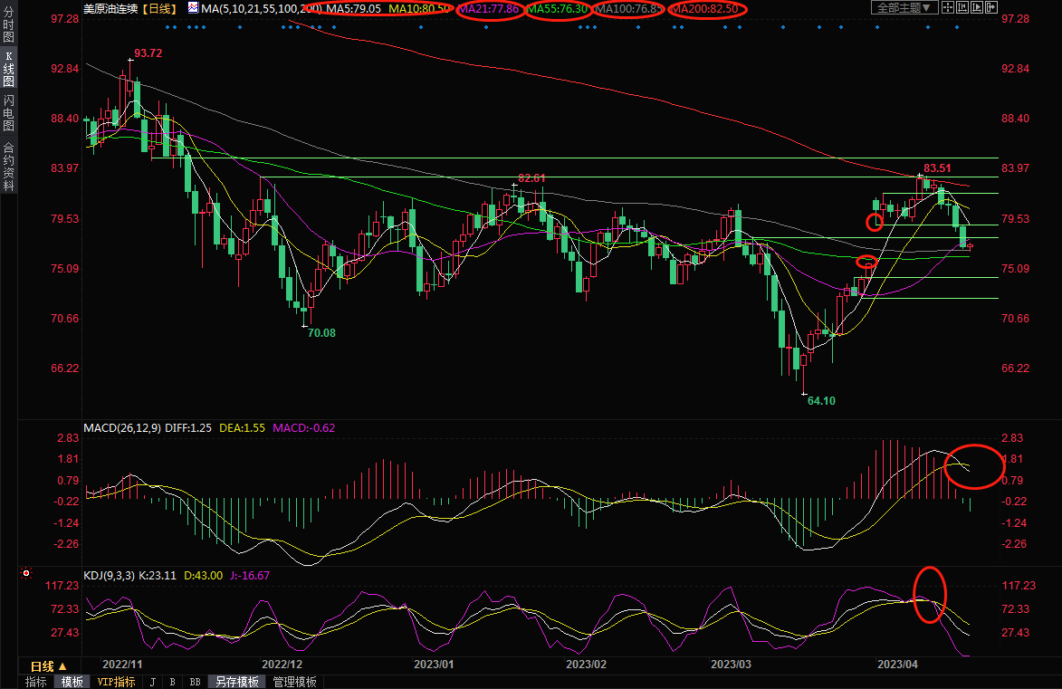 日线级别:震荡下跌;油价在200日均线受阻后持续走弱,5日均线下穿10日均线结成死叉,MACD相对高位结成死叉,KDJ死叉信号延续,后市偏向空头,可能会进一步回补3月31日-4月3日的缺口,缺口下沿支撑在75.69附近。不过,在此之前,油价存在100日均线76.85和55日均线76.29两道关键支撑,目前这两根均线水平运行,支撑相对较强,考虑到近几个交易日油价跌幅较大,需要提防油价震荡反弹调整的可能性。