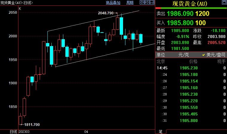 现货黄金下跌0.96%至1984.66美元/盎司;COMEX期金主力合约下跌1.16%至1995.7美元/盎司;