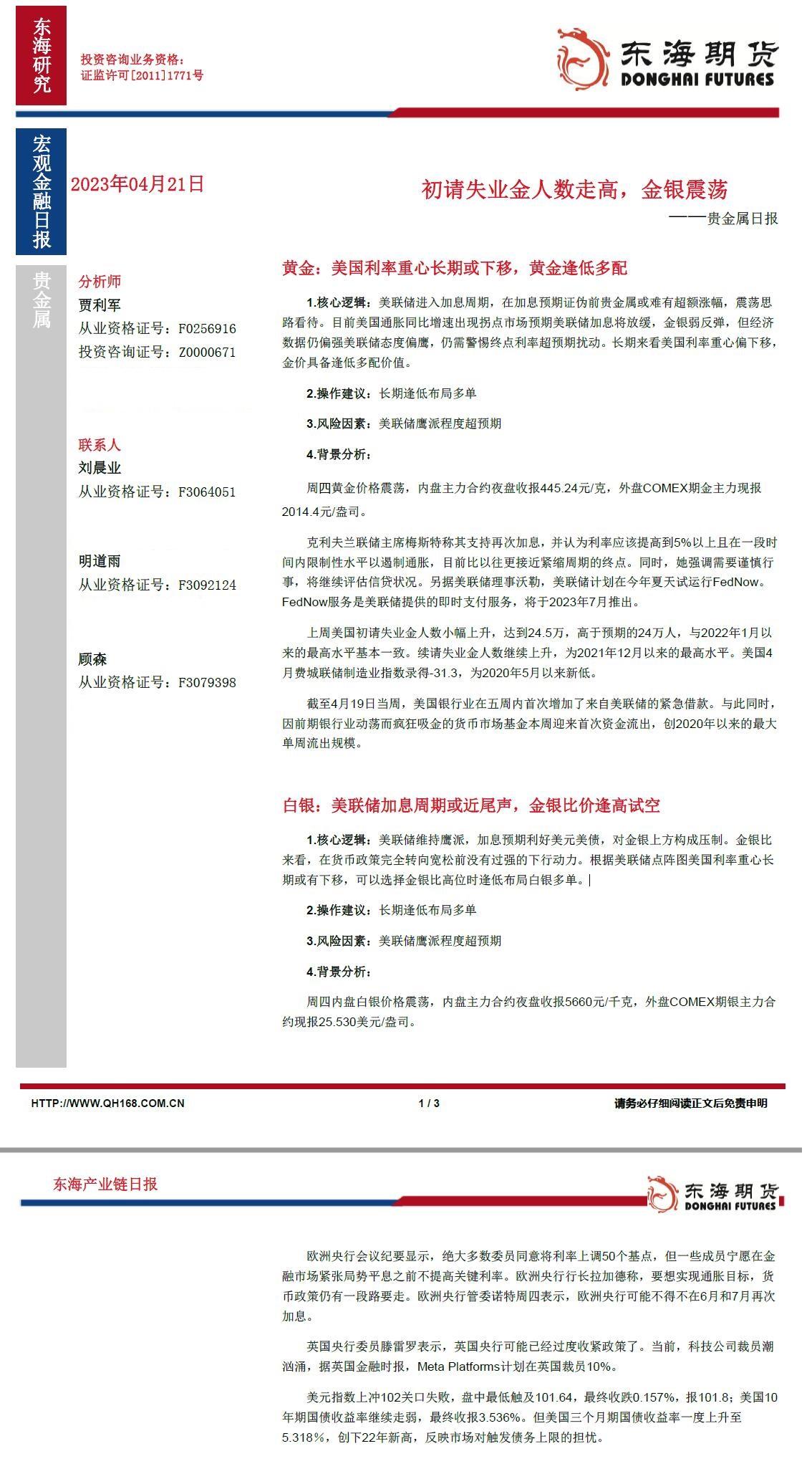 标题:【东海期货4月21日产业链日报】贵金属篇:初请失业金人数走高,金银震荡