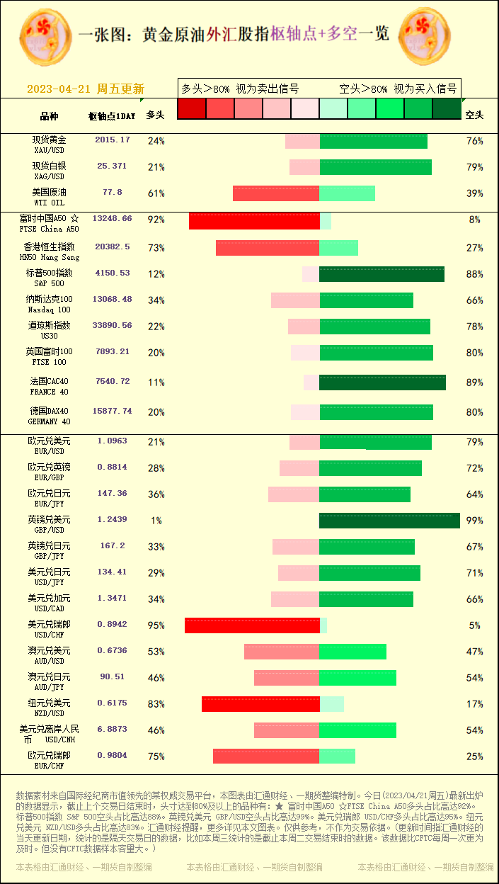 标题:一张图:2023/04/21黄金原油外汇股指"枢纽点+多空占比"一览