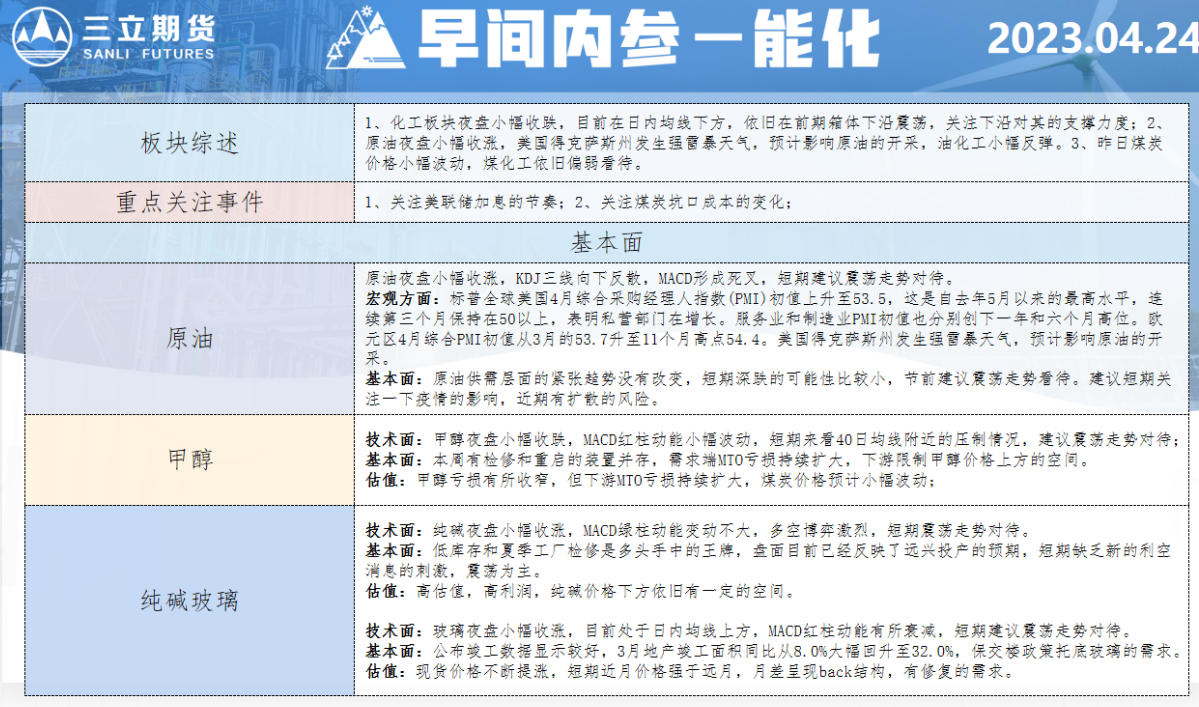 三立期货早间内参显示,原油短期建议震荡走势对待;甲醇技术面建议短线震荡走势对待;玻璃技术面建议短期震荡走势对待。