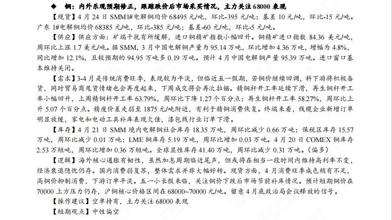 汇通财经APP讯——广发期货发布4月5日早知道,在去美元化的趋势下未来贵金属持仓有望继续增长;铜空单持有,主力关注68000表现;钢材关注3500一线支撑;铁矿石建议06或07合约偏空操作;焦煤建议远月暂且观望为主;豆粕操作上空07买09继续持有;生猪前期09空单继续持有;原油短期区间波段操作为主,布油参考80-90美元;PTA近月短线低多。