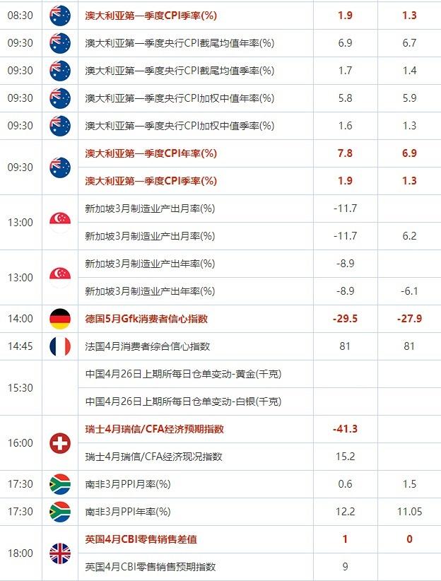 09:30 澳大利亚第一季度CPI年率(%) , 前值 7.8 , 预期值 6.9 , 公布值:待发布09:30 澳大利亚第一季度CPI季率(%) , 前值 1.9 , 预期值 1.3 , 公布值:待发布13:00 新加坡3月制造业产出月率(%) , 前值 -11.7 , 预期值 -- , 公布值:待发布