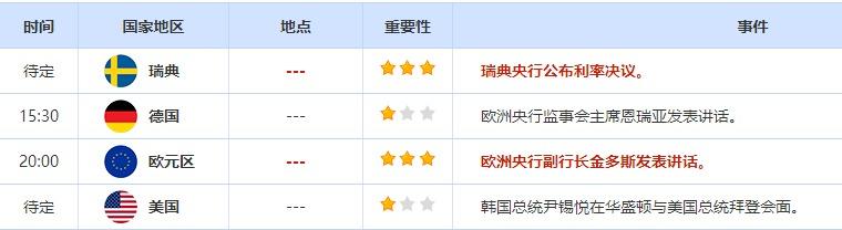 汇通财经APP讯——4月26日,投资者需要关注的重点数据:澳大利亚第一季度CPI季率,澳大利亚第一季度CPI年率,德国5月Gfk消费者信心指数,英国4月CBI零售销售差值,美国3月批发库存月率初值,美国3月耐用品订单月率初值,美国截至4月21日当周EIA原油库存变动。需要关注的大事件包括瑞典央行公布利率决议,欧洲央行副行长金多斯发表讲话。