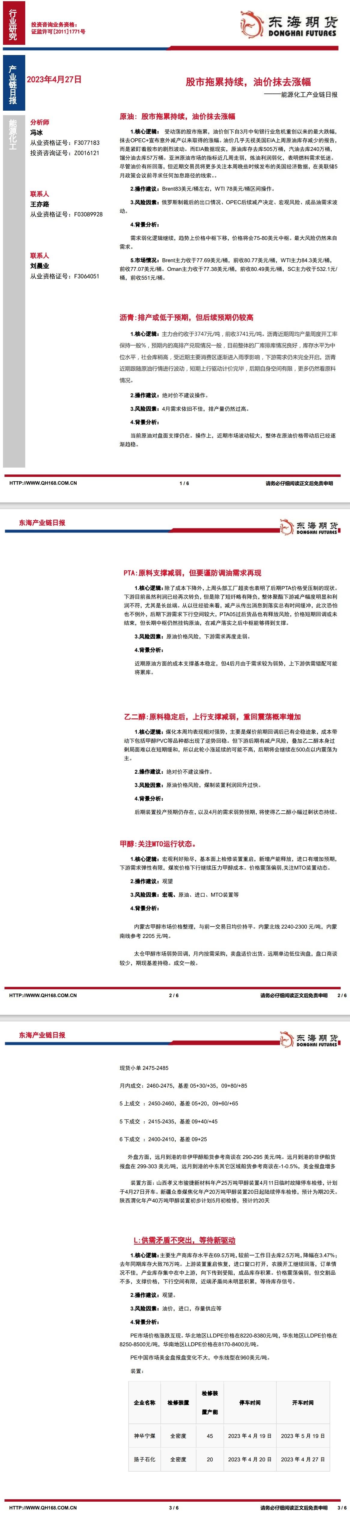 标题:【东海期货4月27日产业链日报】能化篇:股市拖累持续,油价抹去OPEC减产后涨幅