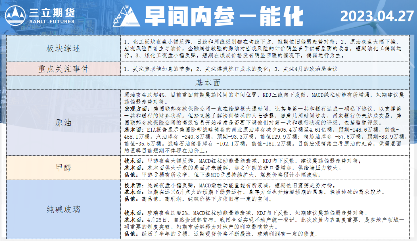 三立期货早间内参显示,原油短期建议震荡偏弱走势对待;甲醇技术面建议短线震荡偏弱走势对待;玻璃技术面建议震荡偏弱走势对待。