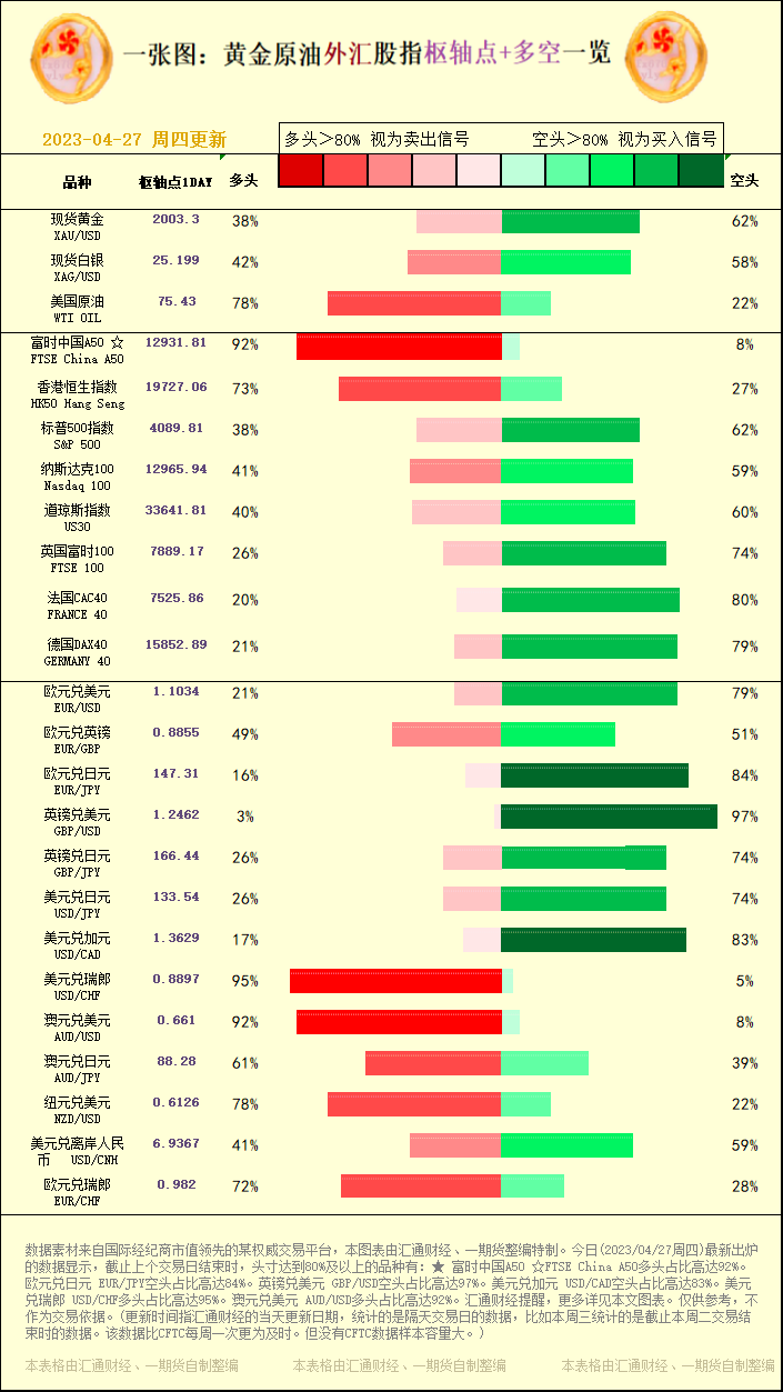 标题:一张图:2023/04/27黄金原油外汇股指"枢纽点+多空占比"一览