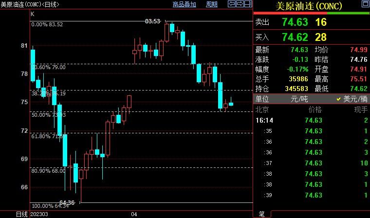 北京时间16:17,NYMEX原油期货下跌0.23%至74.59美元/桶;ICE