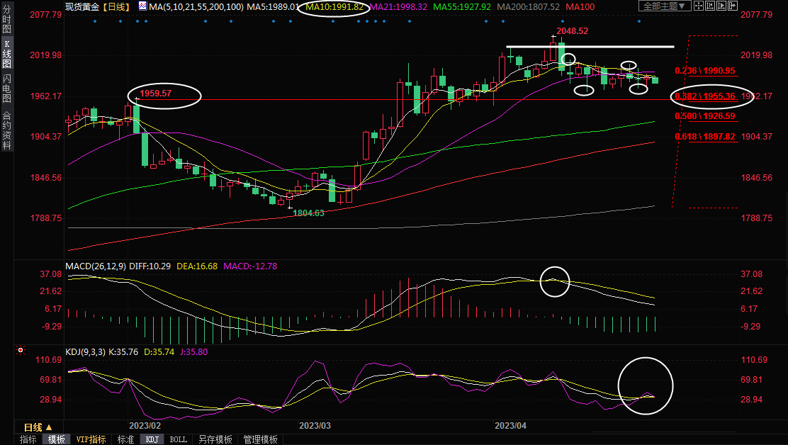 日线级别:震荡;金价受到布林线中轨的压制,也回落至5日均线和10日均线下方,MACD市场运行,KDJ低位金叉被初步破坏,短线金价略微偏向震荡下行,初步支撑在上周低点1974.04附近,4月19日触及的近一个月低点支撑在1969.14附近,布林线下轨支撑目前也在该位置附近,如果失守该支撑,则增加短线看空信号,2月2日低点支撑在1960关口附近,1805-2048涨势的38.2%回撤位支撑在1855.36附近,如果失守该支撑,则增加中线看涨信号。