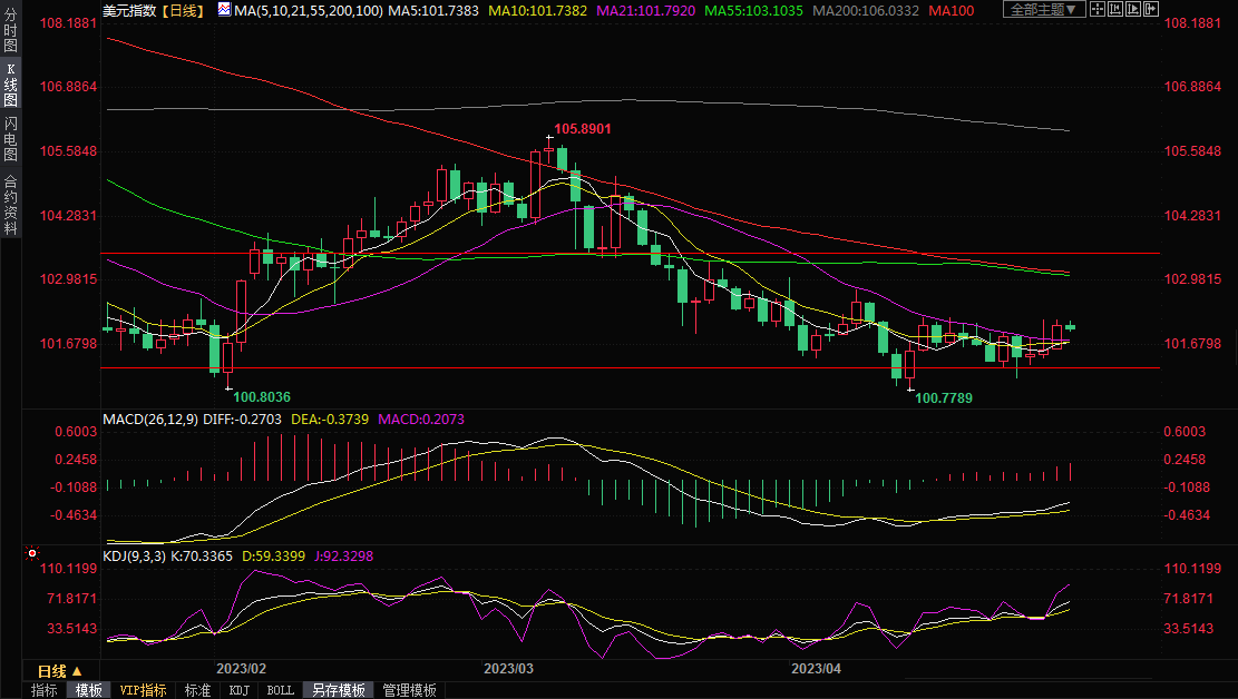 美元指数周一纽约尾盘上涨0.5%,报102.11,稍早曾达到102.19的4月19日以来最高。