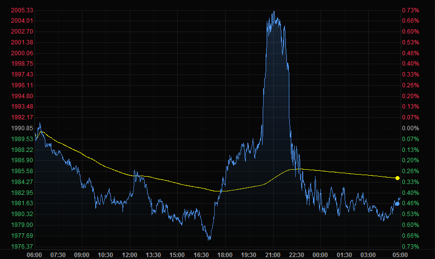 现货黄金周一震荡下跌0.4%,收报每盎司1981.58美元,扭转了盘中早些时候近1%的涨幅。美国期金收于1,992.20美元,下跌0.3%。