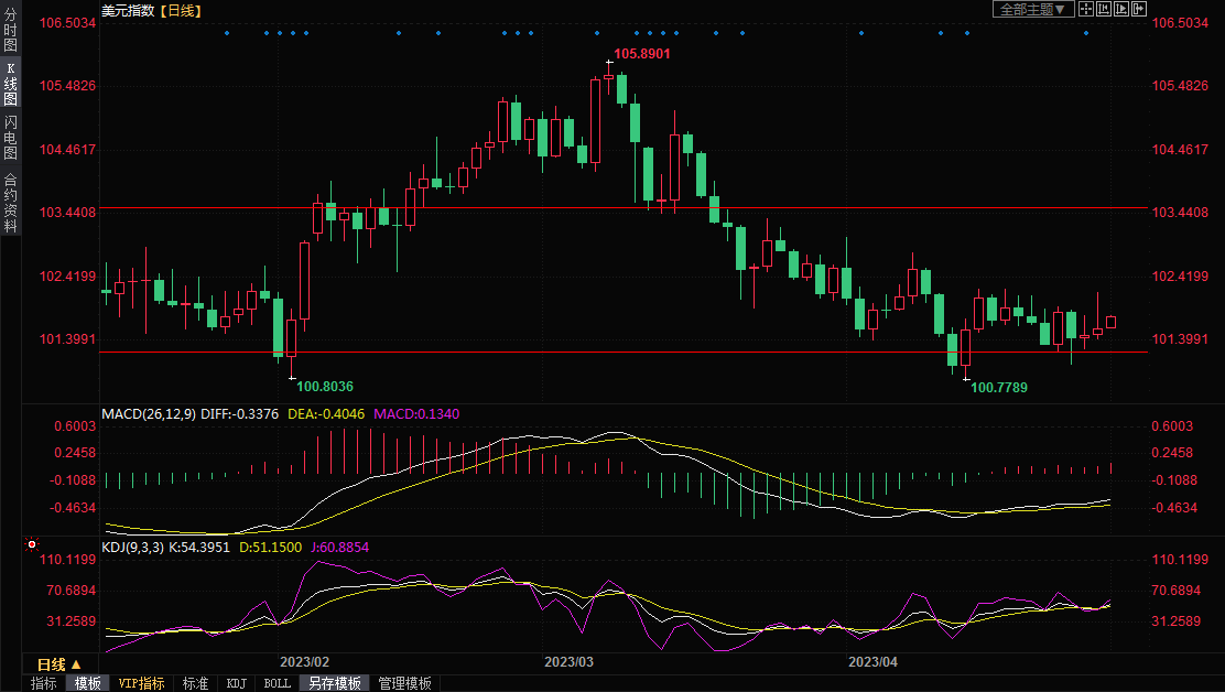 美元指数震荡上涨,创近两周新高至102.19,收报102.11,为连续第三交易日上涨,市场预计美联储本周将再加息25个基点,而且且此前数据显示美国4月制造业脱离三年低点。金价则冲高回落,