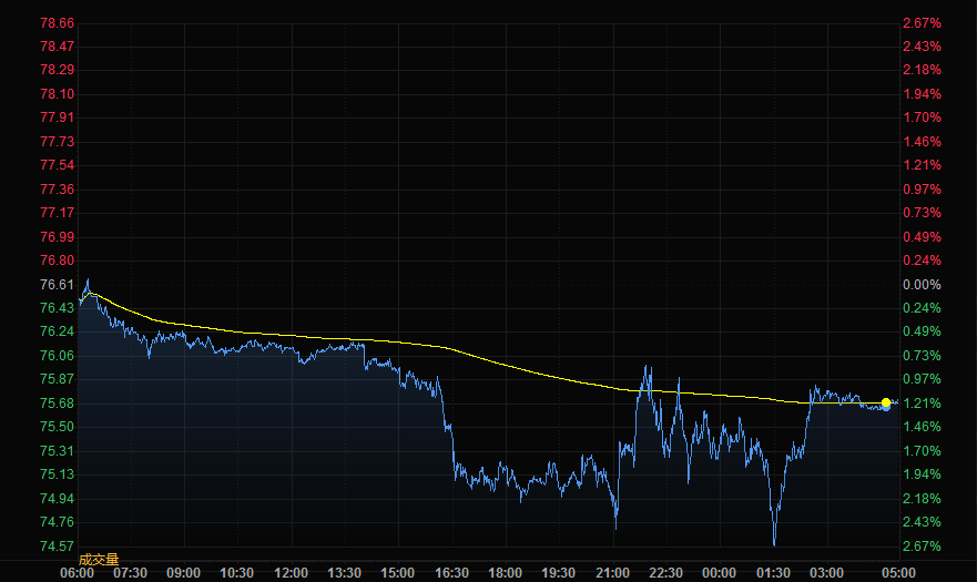布伦特原油期货周一下跌1.02美元,或1.3%,结算价报每桶78.45美元,美国原油期货下跌1.12美元,或1.5%,结算价报75.66美元。