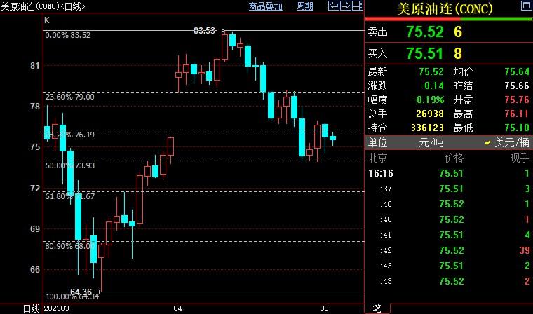 北京时间16:17,NYMEX原油期货下跌0.21%至75.50美元/桶;ICE