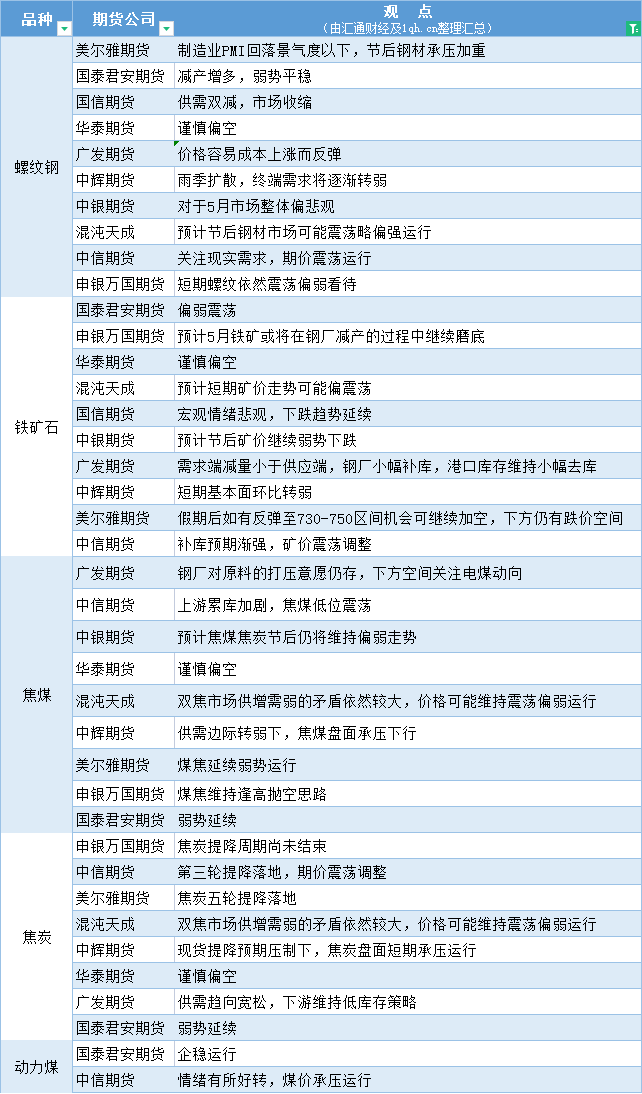 标题:期货公司观点汇总一张图:5月4日黑色系(螺纹钢、焦煤、焦炭、铁矿石、动力煤等)