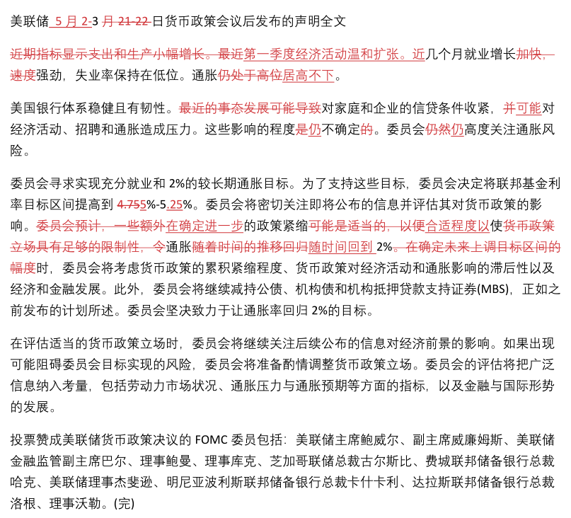 在2022年3月以来连续第10次加息后,美联储目前的指标隔夜利率区间升至5.00%-5.25%。美联储在声明中不再称“预计”将需要进一步加息,而是表示将观察未来出炉的数据,以确定进一步加息是否“可能是合适的”,这是一个明显的态度转变。以下为美国联邦储备委员会(美联储/FED)的联邦公开市场委员会(FOMC)在5月2-3日货币政策会议后发布的声明全文:第一季度经济活动温和扩张。近几个月就业增长强劲,失业率保持在低位。通胀居高不下。