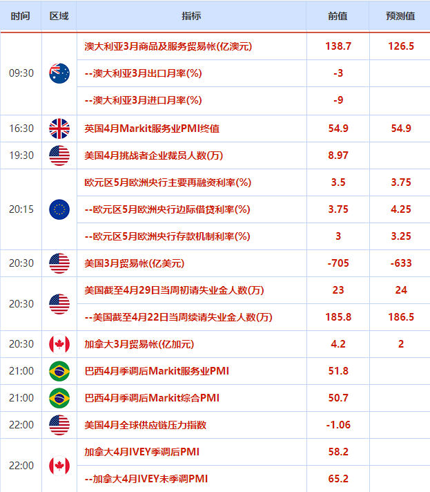 美国4月服务业稳定增长;但价格具有粘性或导致通胀仍高企美国服务业在4月份保持稳定的增长速度,因为在出口激增的情况下,新订单有所增加,但企业投入物价继续上升,这表明通胀可能仍然高企。美国供应管理协会(ISM)非制造业采购经理人指数(PMI)在上个月从3月的51.2上升到51.9。另外ADP全国就业报告显示,私营企业就业岗位在3月增加14.2万个后,4月又增加了29.6万个。