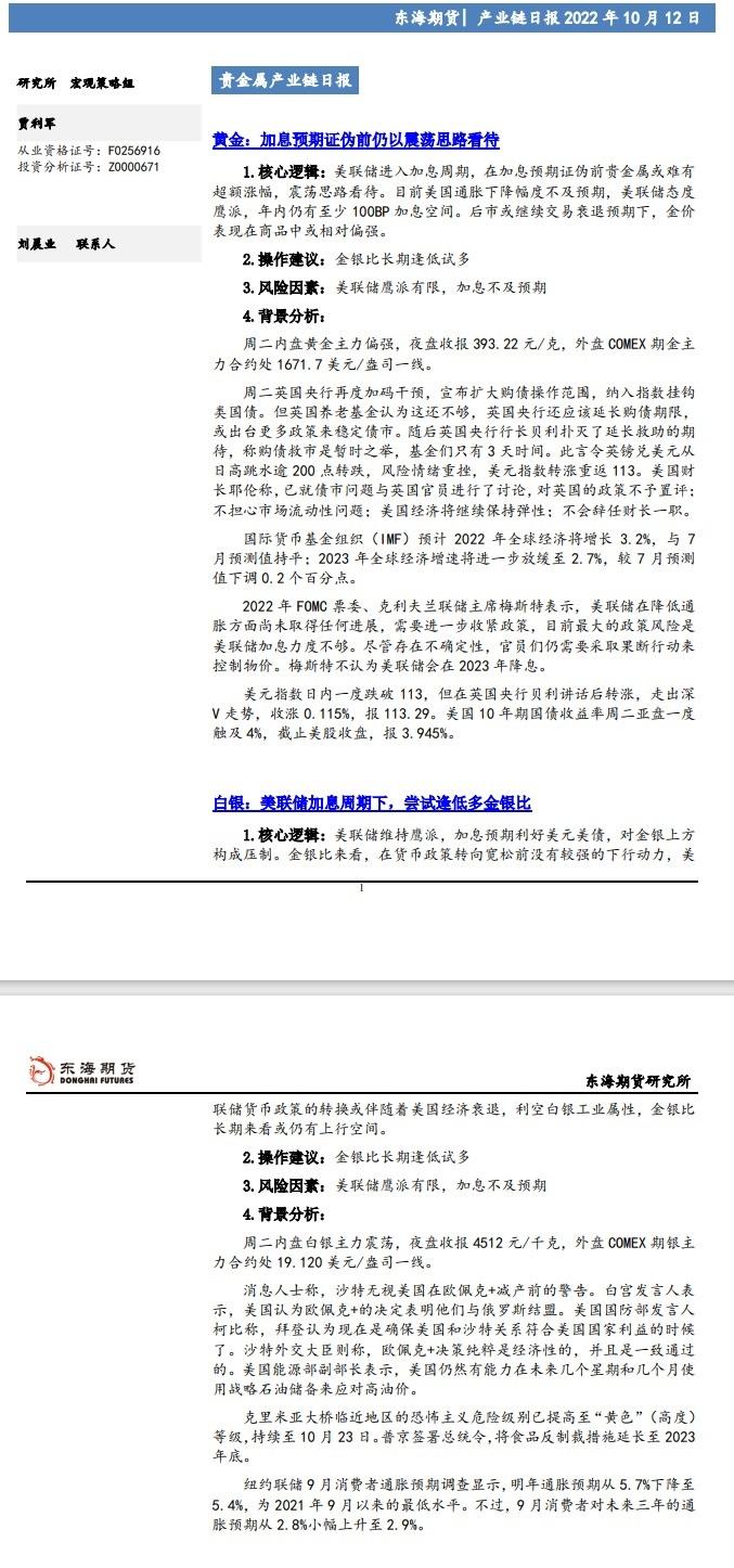 标题:【东海期货10月12日产业链日报】贵金属篇:美元指数偏强,外盘金银延续回落