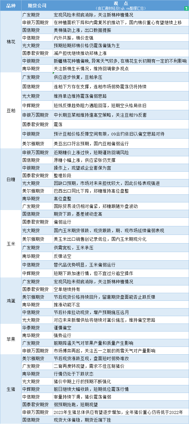 标题:期货公司观点汇总一张图:5月5日农产品(棉花、豆粕、白糖、玉米、鸡蛋、生猪等)