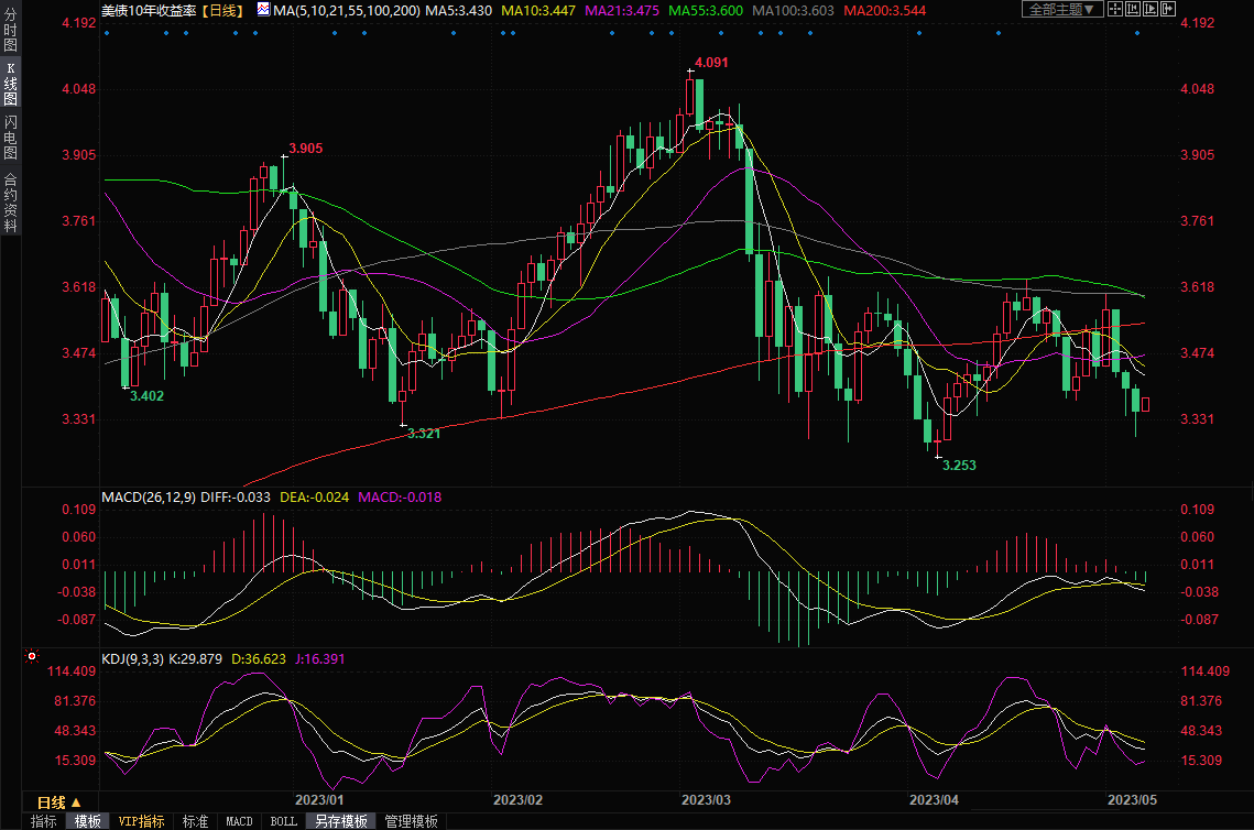 10年期国债收益率周四下跌,尾盘报3.352%,为连续三个交易日下跌,盘中一度触及3.296%,为4月7日以来新低;不过,周五亚市,10年期美债收益率小幅反弹,目前上涨近1%,交投于3.385%附近。