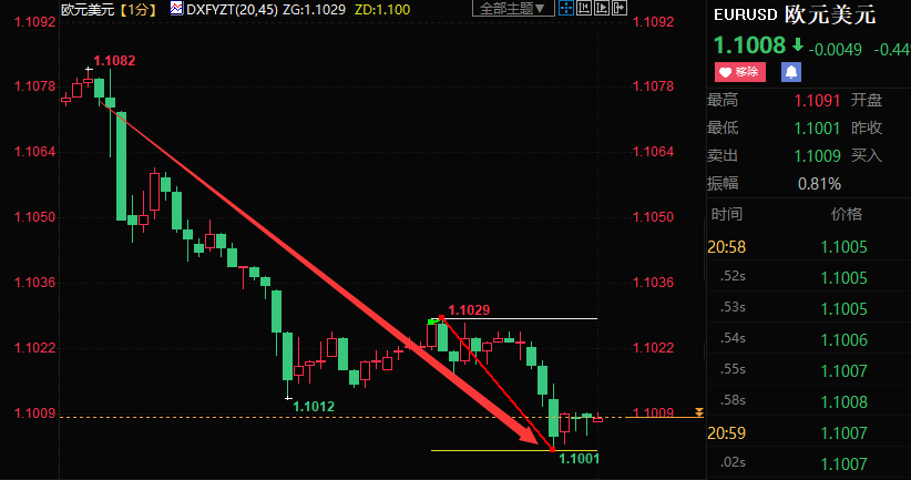 欧元兑美元下跌27点至1.1001,欧银新政公布以来累计下跌75点。