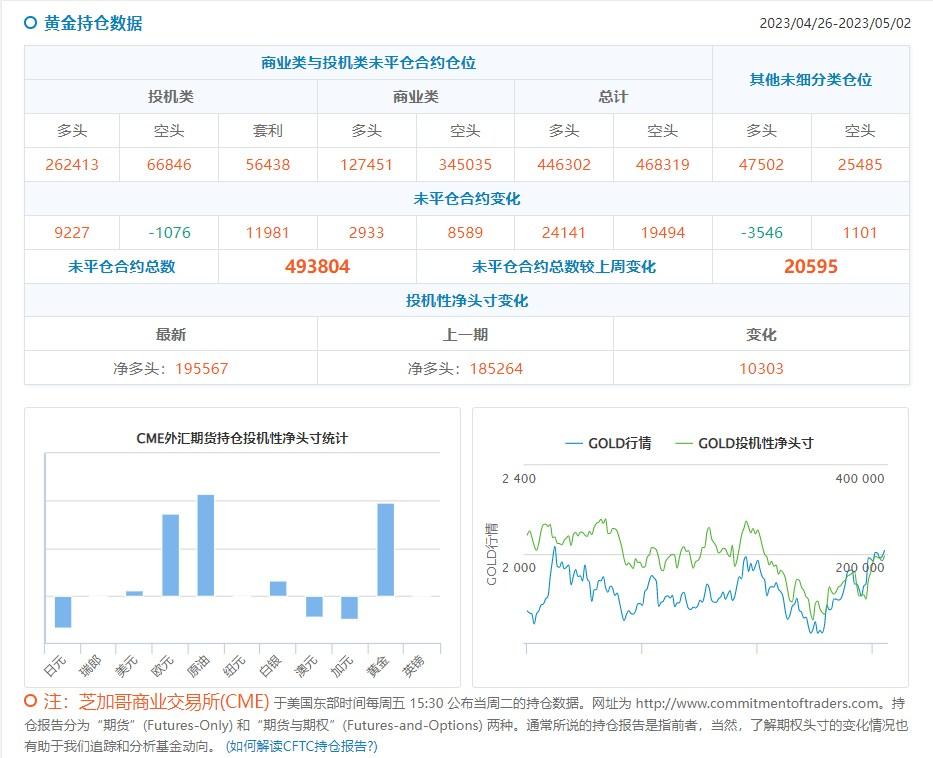 截至2023年5月2日的一周内,日元净空头头寸为减少68,324手。欧元净多头头寸增加173,489手。英镑净多头头寸增加1065手。瑞郎净空头头寸减少2999手。
