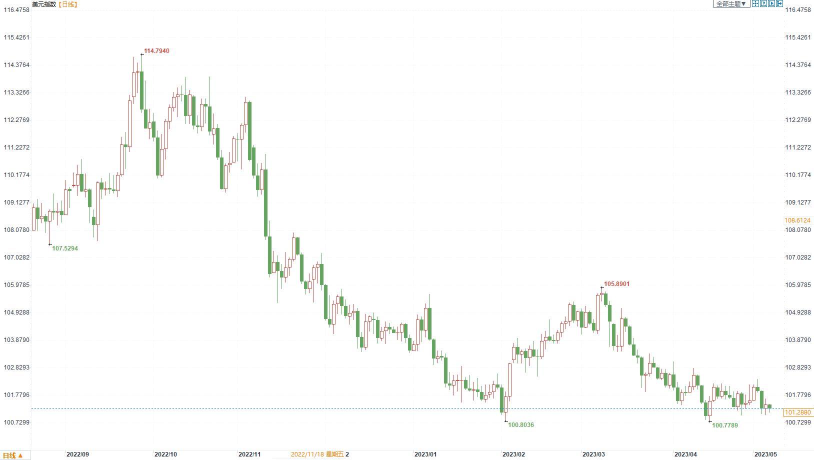 美元指数基本维持震荡走势,美联储本周决议加息25基点之后,释放相对鸽派的基调,给美元带来压力。不过良好的美国经济数据,加之银行业危机、全球经济放缓等避险需求,美元基本维持震荡走势。