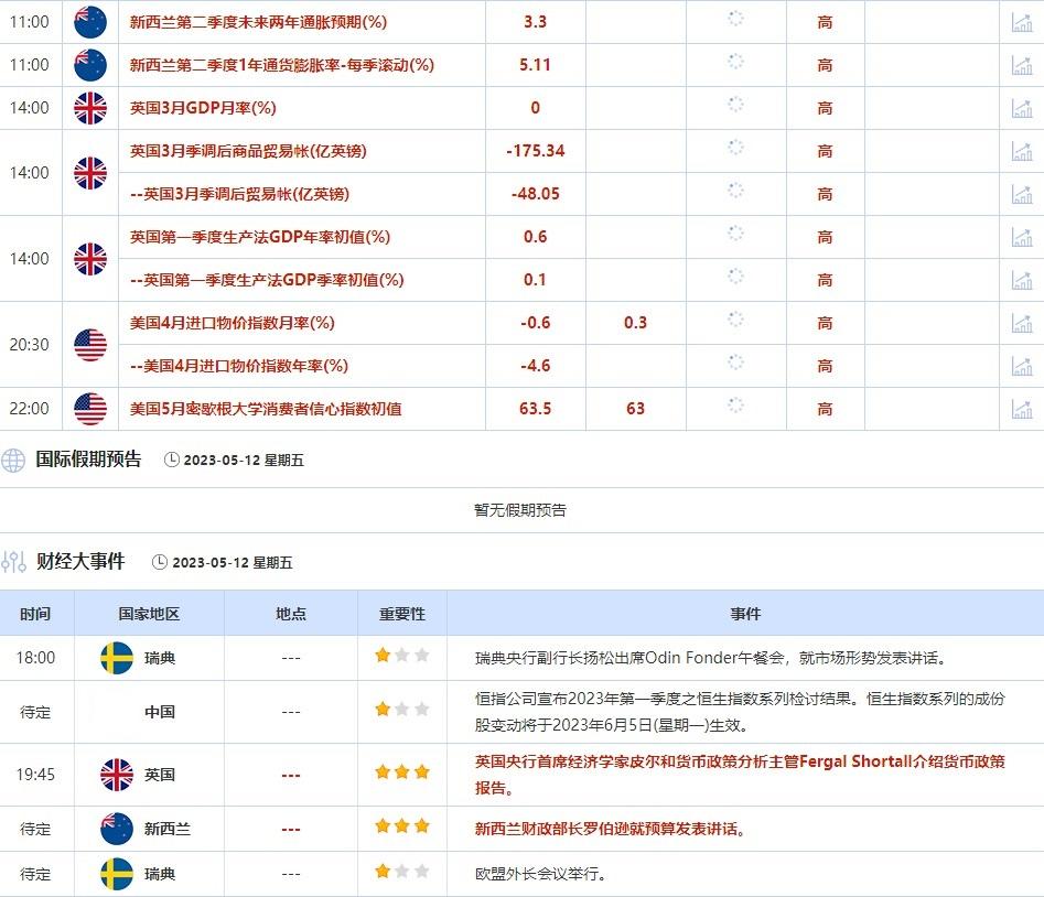 5月12日,英国央行首席经济学家皮尔和货币政策分析主管Fergal Shortall介绍货币政策报告。此外,当天新西兰财政部长罗伯逊就预算发表讲话,或对未来经济发展产生影响,投资者也需引起注意。 除了以上重点数据和大事件,投资者还需关注全球疫情和乌克兰局势的发展,或也会对金融市场造成一定影响。