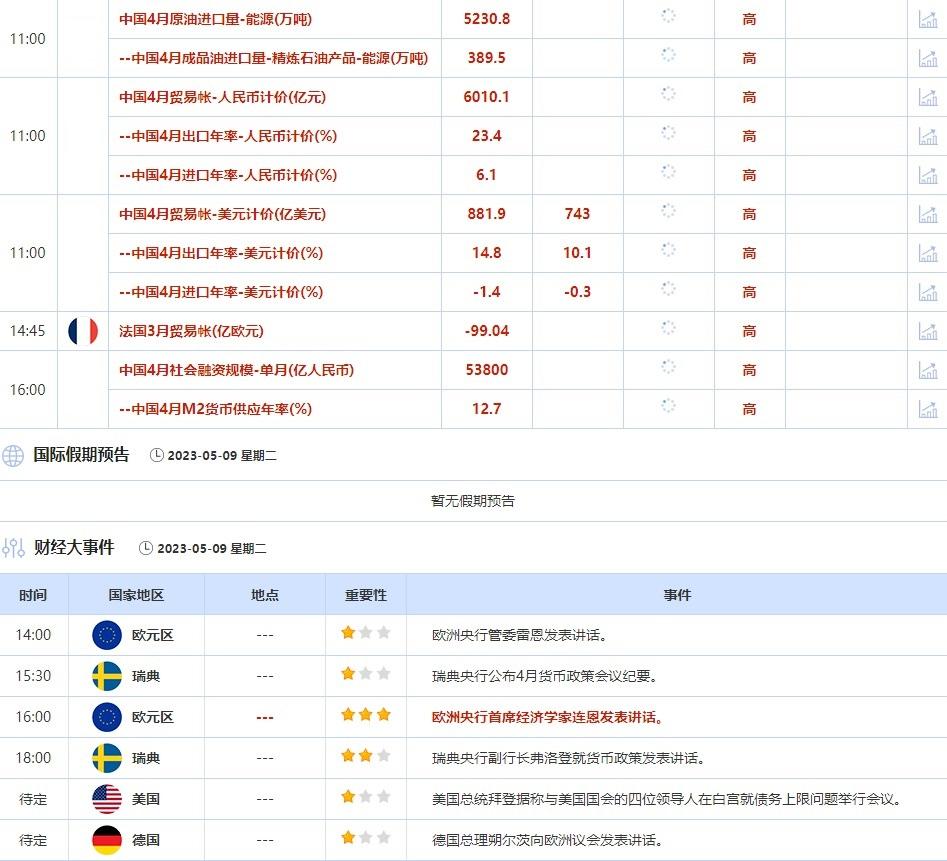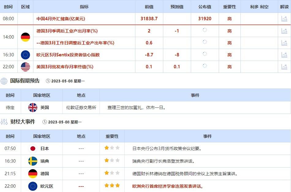 5月8日,欧元区将公布5月Sentix投资者信心指数,市场预期为-8,略好于-8.7的前值。5月8日,英国伦敦证券交易所因查理三世的加冕礼,休市一日。欧洲央行首席经济学家连恩在4月底接受采访时表示,近期数据支持5月继续加息。5月8日,连恩将发表讲话,投资者需关注他的最新观点。