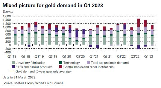 WGC在最新季度需求趋势报告中表示,总需求为1081吨,比2022年第一季下降13%。大约一半的黄金需求来自珠宝商,其余大部分来自投资者和政府。黄金被视为一种安全资产,投资者往往在经济不稳定时期买入更多黄金。