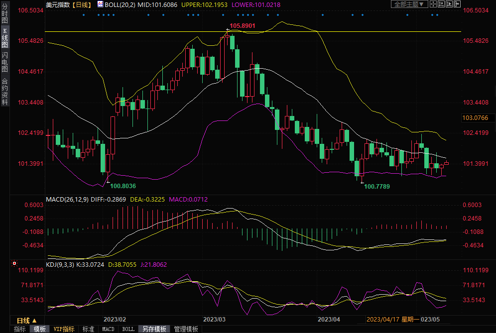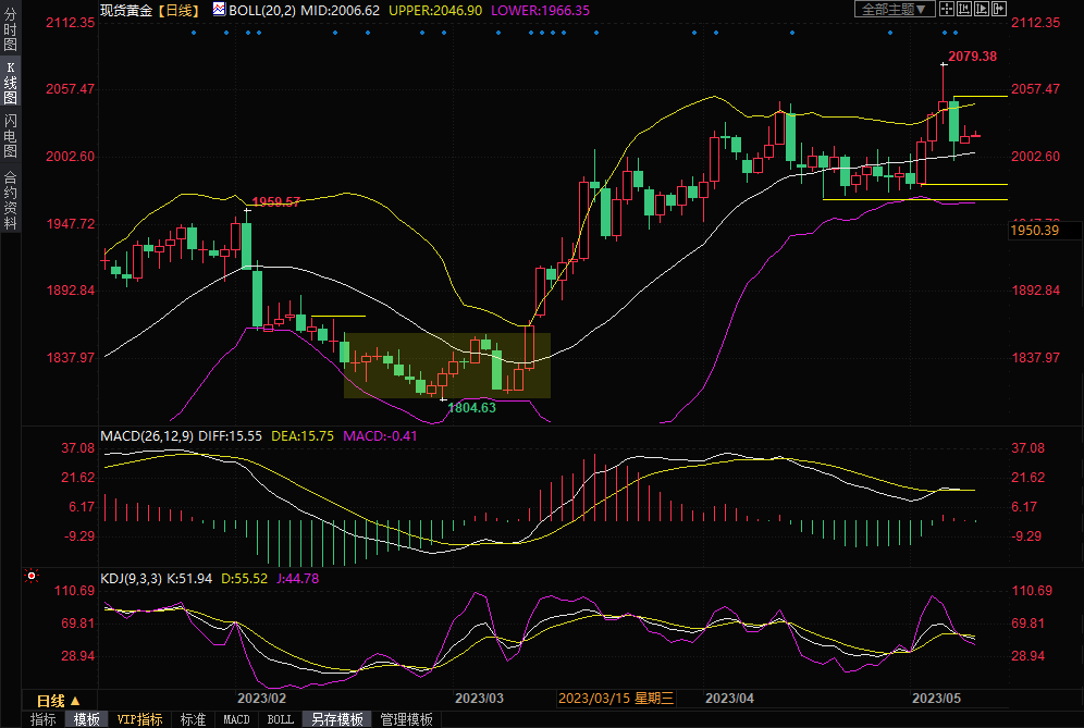 整体来看,欧元区仍处于高位,未来仍有一定的加息压力,英国央行本周也将加息,市场对美联储6月份再次加息的预期也小幅升温,这意味着持有黄金的机会成本将继续增加,而美元和美债收益率的反弹也令金价承压,短线金价仍有一定的回调风险,关注布林线中轨20006.62和2000关口附近支撑。不过,对美国债务违约危机的担忧和对美联储年内将降息的预期,料将限制金价的回调空间,中线金价仍有震荡走高的机会。北京时间10:11,