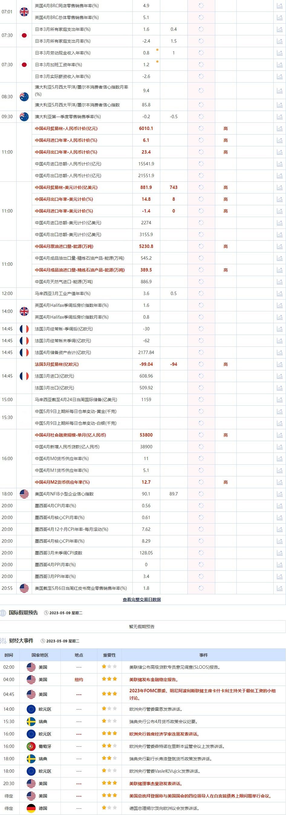 汇通财经APP讯——5月9日,投资者需要关注的重点数据:中国4月贸易帐,中国4月进出口年率,法国3月贸易帐,中国4月社会融资规模和中国4月M2货币供应年率。 需要关注的大事件包括欧洲央行首席经济学家连恩发表讲话,美联储理事杰斐逊发表讲话 ,美国总统拜登据称与美国国会的四位领导人在白宫就债务上限问题举行会议。