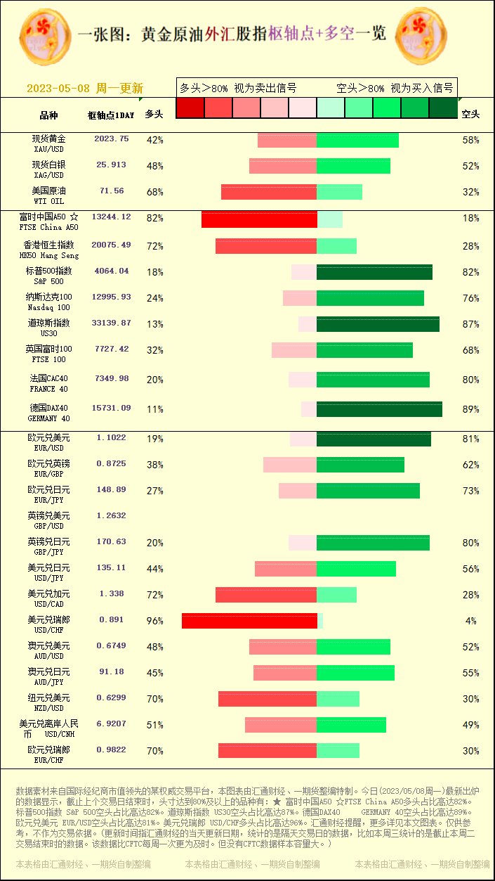 标题:一张图:2023/05/08黄金原油外汇股指"枢纽点+多空占比"一览