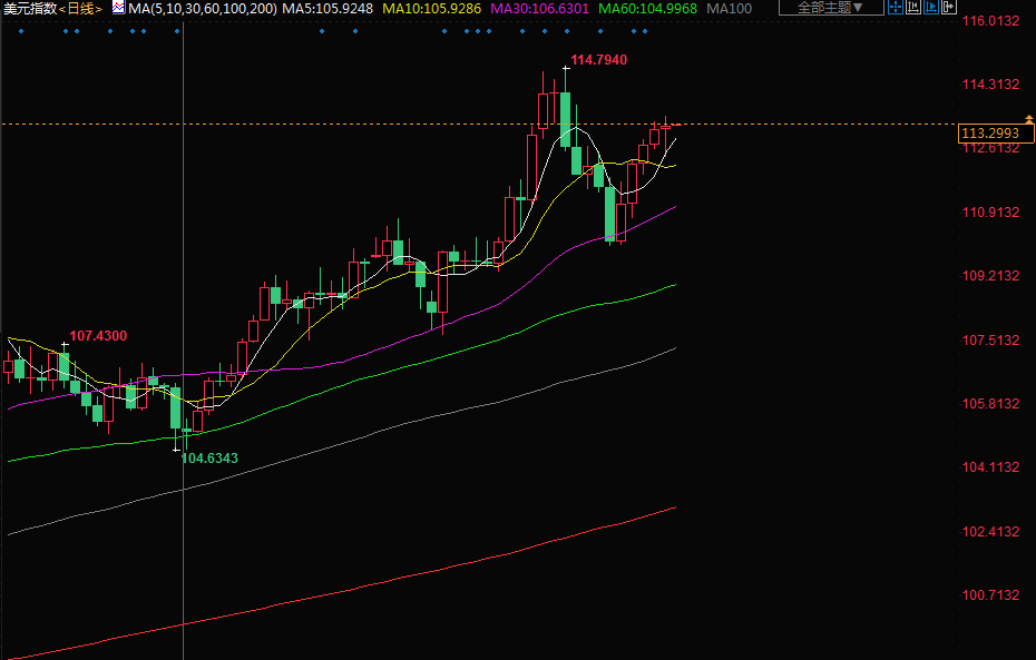 美元指数上涨0.2%,至113.25,离上月末触及的20年高点114.78不远。