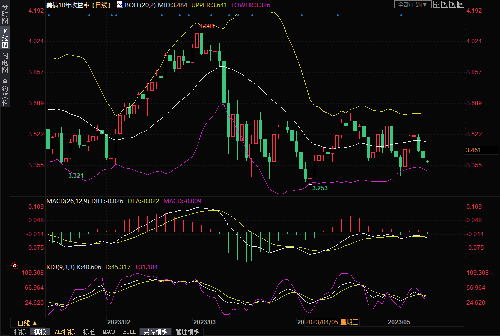 10年期美债收益率周四盘中一度跌至3.345%,为5月5日以来新低,虽然在明尼阿波利斯联储卡什卡利讲话后跌幅收窄,仍收盘仍下跌逾1%,收报3.397%,周五亚市早盘,10年期美债收益率延续跌势,目前下跌0.65%,交投于3.375%附近。