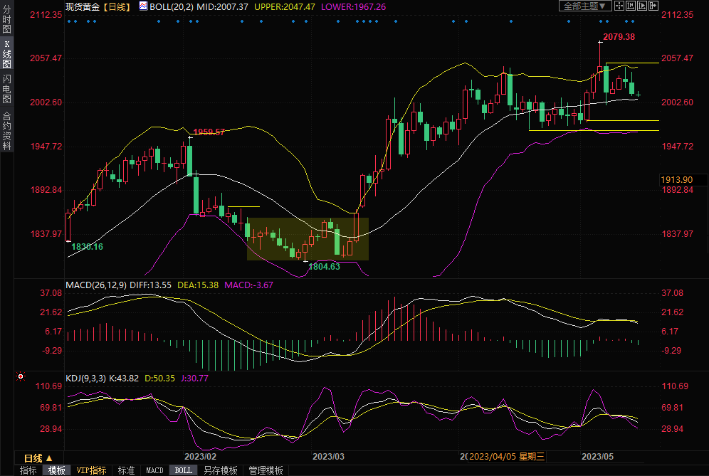 整体来看,虽然避险情绪也给金价提供支撑,但更多的资金涌入美元,美元指数走强对金价压制明显,而且美元短线看涨信号有所增强,这令金价短线面临进一步下行压力,虽然市场预计美联储6月份将暂停加息,但基本已经被市场消化,短线可能无法给金价提供进一步上涨动能。技术面来看,MACD和KDJ初步死叉,短线金价下破布林线中轨2007.39附近支撑的可能性有所增加,有望进一步向布林线下轨1967.27附近回调。北京时间09:45,
