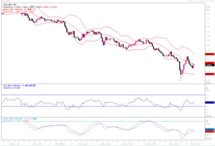 英镑兑美元上涨1.21%,重回至1.11上方,结束了连续五天的跌势。英国金融时报周三援引三位消息人士的话报导,英国央行已私下向银行暗示,如果市场条件需要,它准备延长周五将结束的紧急债券购买计划。英国央行行长贝利此前给出的是相背的意见,他公开告诉英国养老基金和其他受到债券价格暴跌打击的投资者,央行将按计划在周五结束紧急购债计划。英国央行内部这种不统一的意见,将会继续扰动着英镑的走势。日线图上,英镑此轮回落在1.09之上受到暂时的支撑,然汇价仍处于20日均线下方,暂时仍看不到能摆脱跌势的迹象。4小时图上,技术指标上扬,显示一定的多头动能,上方1.11的阻力较为关键,若上破,