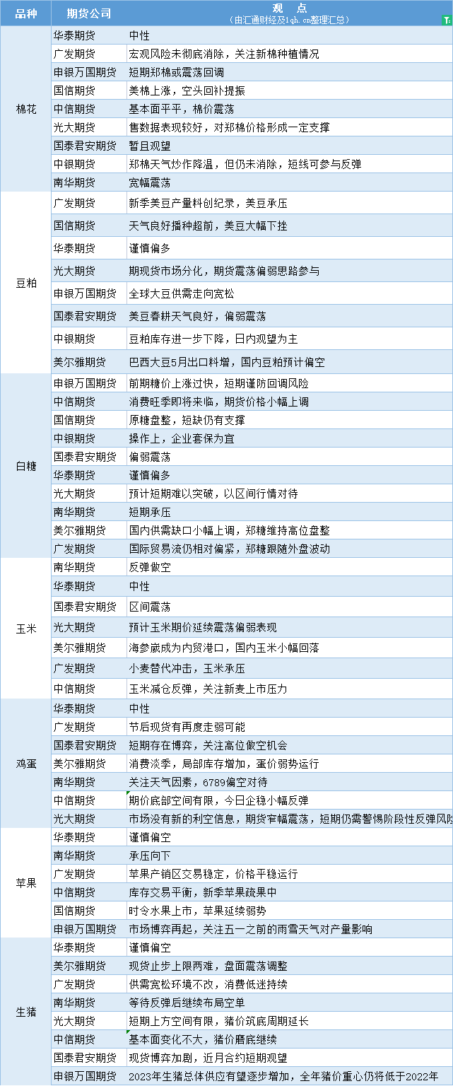 期货公司观点汇总一张图:5月17日农产品(棉花、豆粕、白糖、玉米、鸡蛋、生猪等)