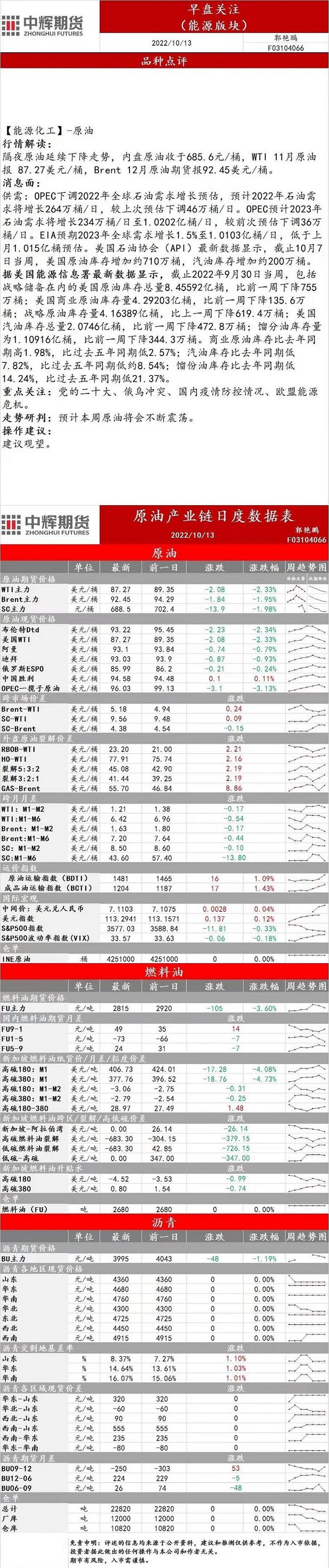 10月13日,中辉期货发布能源早盘关注,预计本周原油将会不断震荡,建议观望。