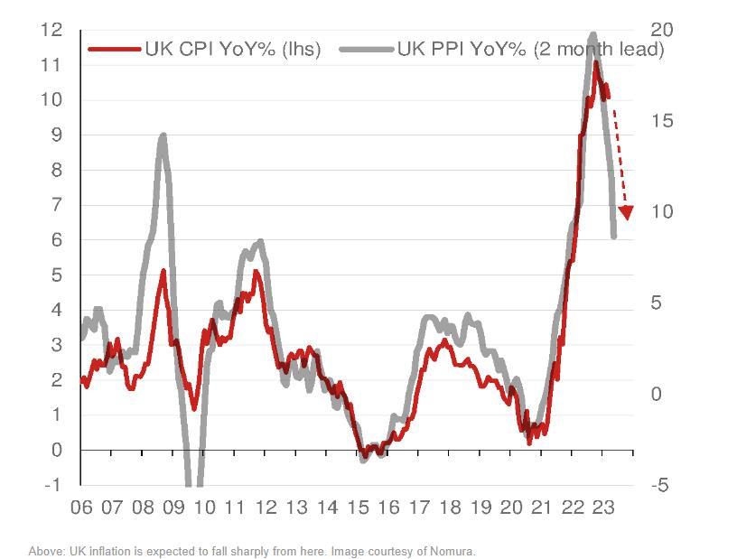如下图所示,英国通胀率预计将从目前水平大幅下降
