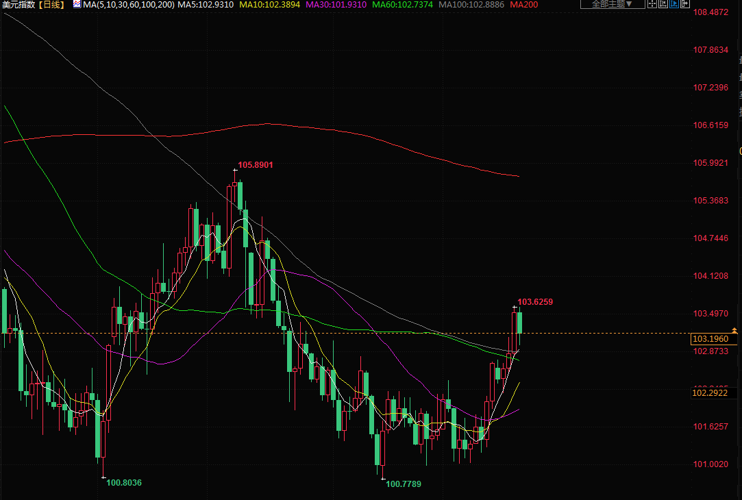 美元指数下跌0.4%,至103.08,上一交易日触及七周最高。本周,美元上涨0.6%。