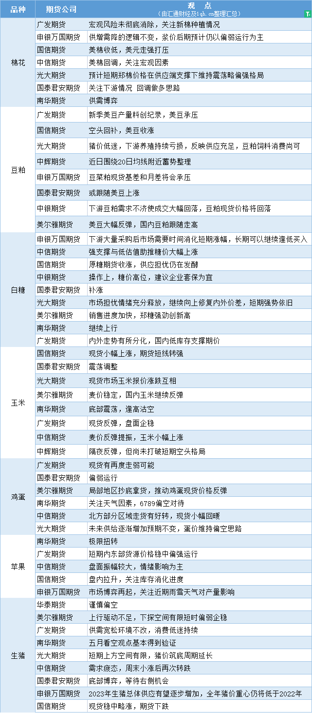 期货公司观点汇总一张图:5月23日农产品(棉花、豆粕、白糖、玉米、鸡蛋、生猪等)