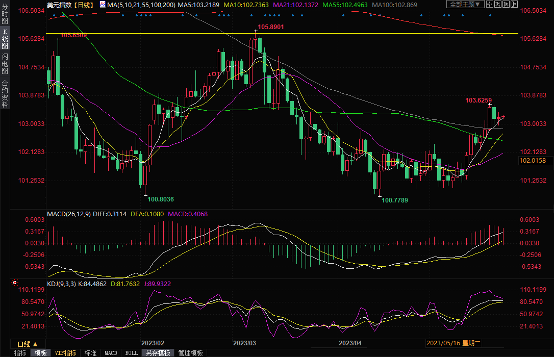美元指数周一小幅上涨,收报103.24,涨幅约0.06%,距离上周四创下近两个月高点不远,而且技术面信号仍偏向多头;经济数据强于预期和美联储官员态度鹰派,使得进一步加息的可能性依然存在。投资者等待新的数据来寻找美联储是否可能继续加息的迹象,同时关注国会达成提高债务上限协议的消息。