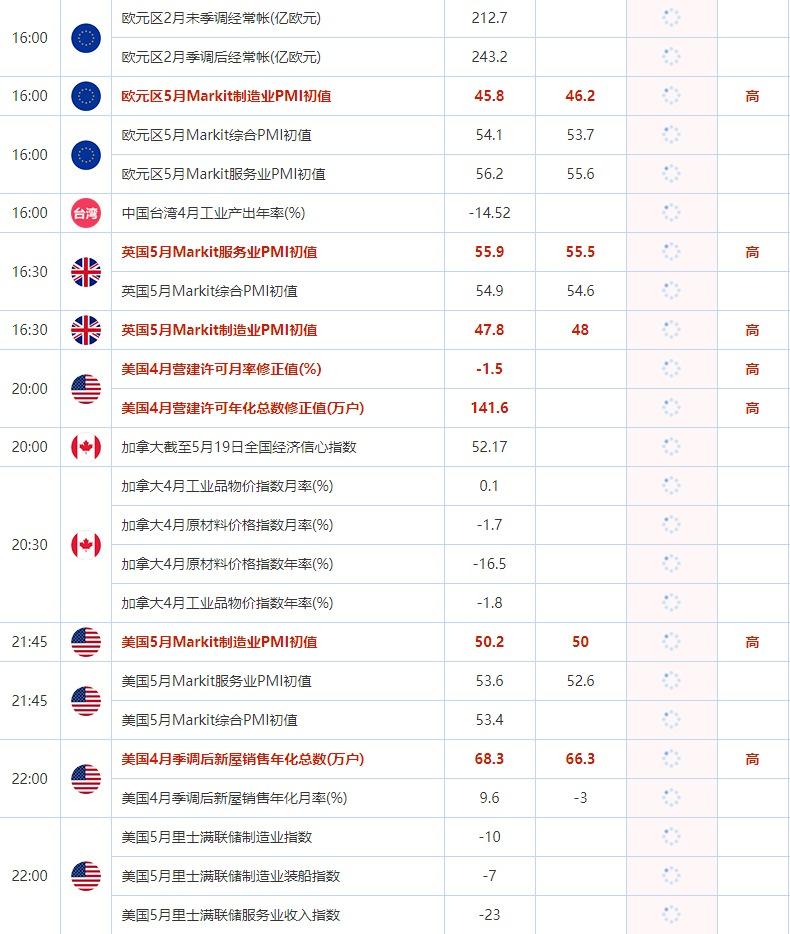 16:00 欧元区5月Markit制造业PMI初值 , 前值 45.8 , 预期值 46.2 , 公布值:待发布16:00 欧元区5月Markit综合PMI初值 , 前值 54.1 , 预期值 53.7 , 公布值:待发布