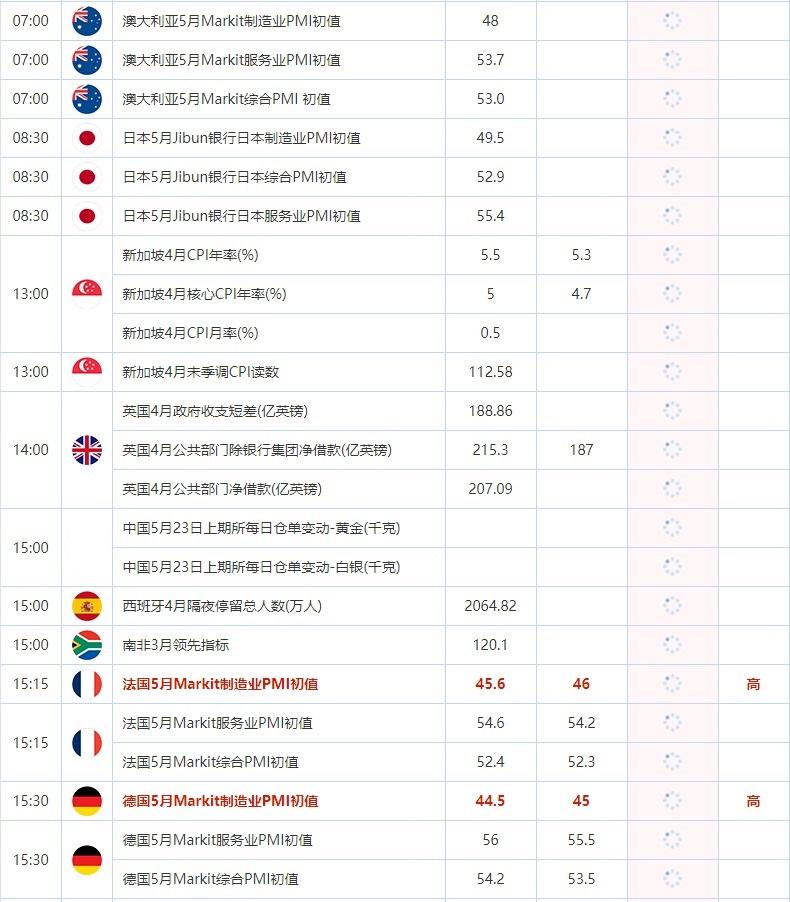 15:15 法国5月Markit制造业PMI初值 , 前值 45.6 , 预期值 46 , 公布值:待发布15:15 法国5月Markit服务业PMI初值 , 前值 54.6 , 预期值 54.2 , 公布值:待发布
